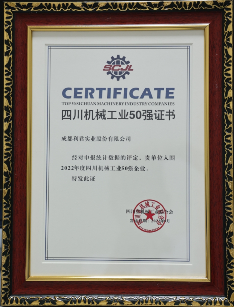 四川機(jī)械工業(yè)50強(qiáng)企業(yè)評(píng)選活動(dòng)由四川省機(jī)械工業(yè)聯(lián)合會(huì)主辦,在省經(jīng)信廳、各市州經(jīng)信局及相關(guān)行業(yè)協(xié)會(huì)的大力支持下,從2020年開始兩年評(píng)定一次,旨在宣傳推廣四川機(jī)械制造行業(yè)企業(yè),增強(qiáng)“四川造”品牌和社會(huì)影響力,推動(dòng)省內(nèi)各類企業(yè)做優(yōu)做強(qiáng)。本次評(píng)選按照“企業(yè)規(guī)?!薄ⅰ皟r(jià)值效益”、“創(chuàng)新轉(zhuǎn)型”、“高質(zhì)量發(fā)展”四項(xiàng)指標(biāo)進(jìn)行綜合評(píng)定,成都利君憑借優(yōu)秀的質(zhì)量效益、強(qiáng)大的自主創(chuàng)新能力、深厚的發(fā)展?jié)摿A得專家評(píng)委一致認(rèn)可,斬獲其殊榮。