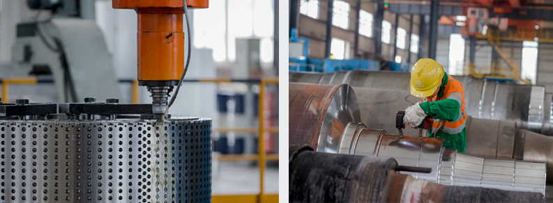 柱釘輥(發(fā)明專利號ZL201110263519.5)是利君自主開發(fā)研制的新一代輥面,由鍛造軸芯、特種合金復合輥套、耐磨硬質合金柱釘構成,其特點為:
